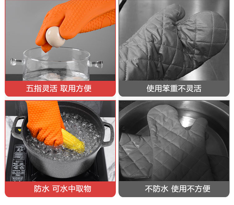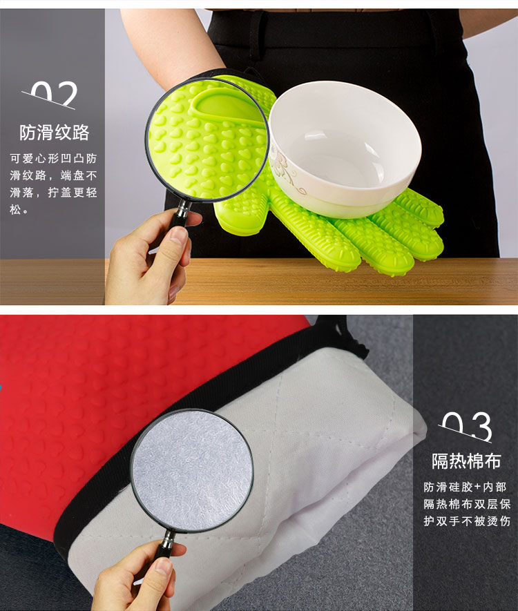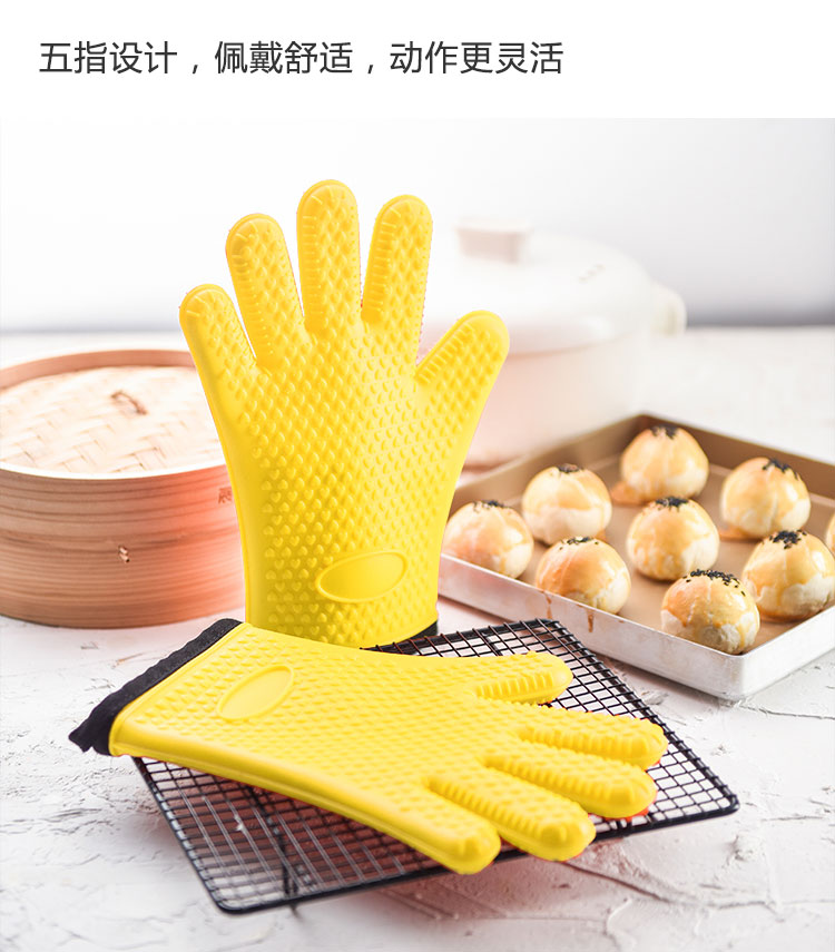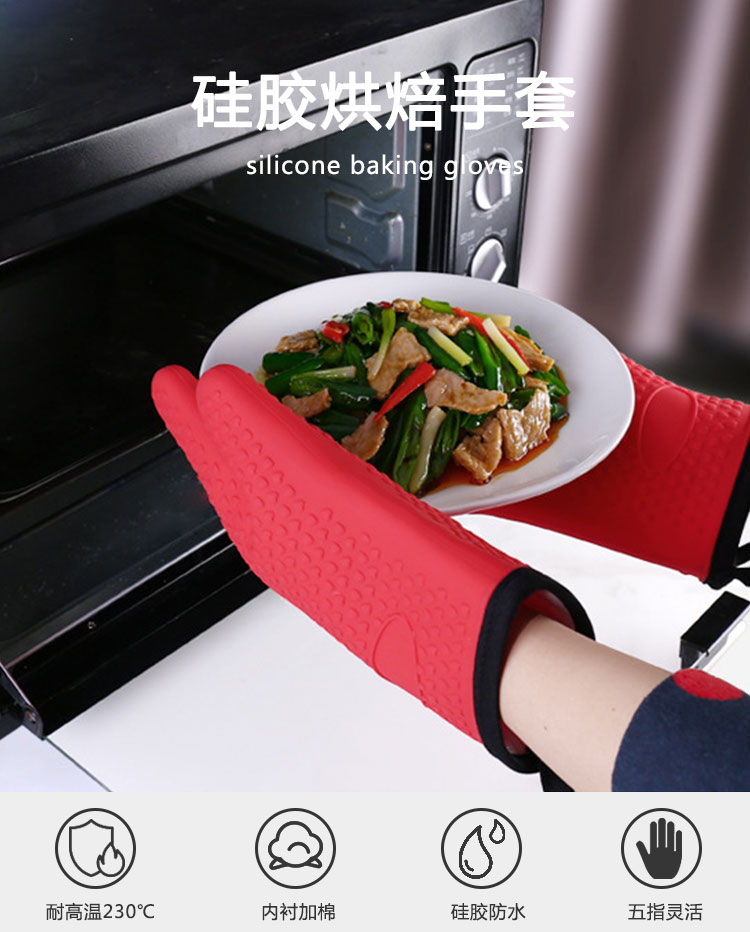 硅膠烘焙手套質(zhì)地柔軟,分指設(shè)計,防滑防臟,內(nèi)置隔熱棉,有效保護雙手。